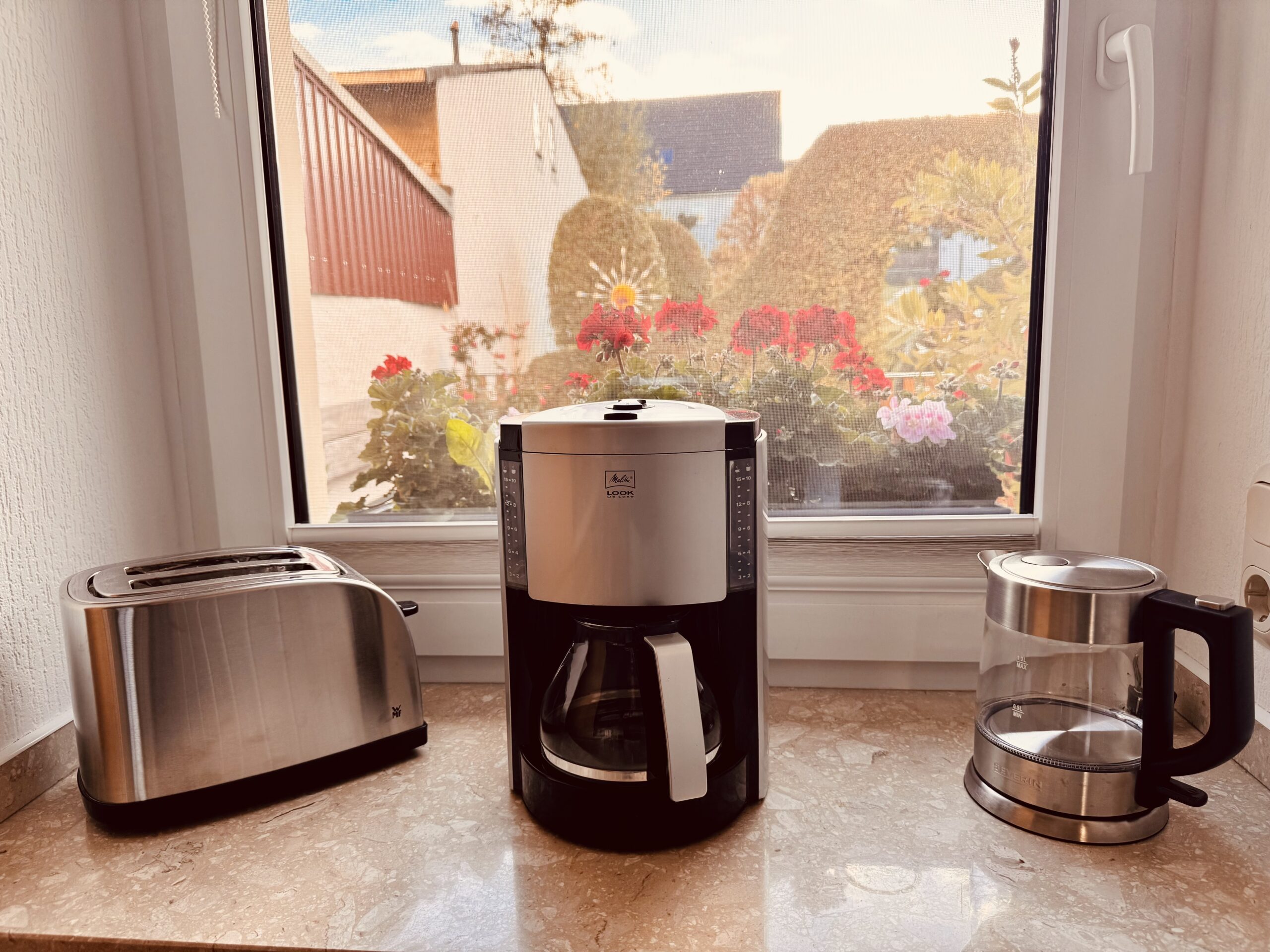 Die Küche mit kleinem Essbereich ist mit einem Umluftofen und Ceranfeld ausgestattet. Natürlich gibt es im Kühlschrank einen Frostbereich und der Geschirrspüler kümmert sich um den Abwasch. Da sich beim Kaffee die Geister scheiden, gibt es sowohl einen Vollautomaten als auch eine klassische Filtermaschine. Natürlich stehen auch ein Toaster sowie Wasserkocher bereit.